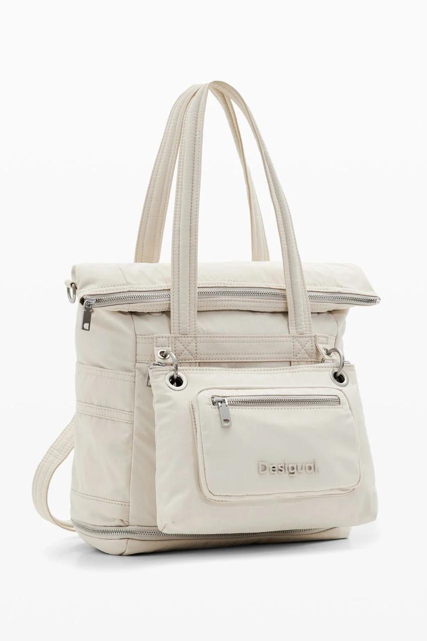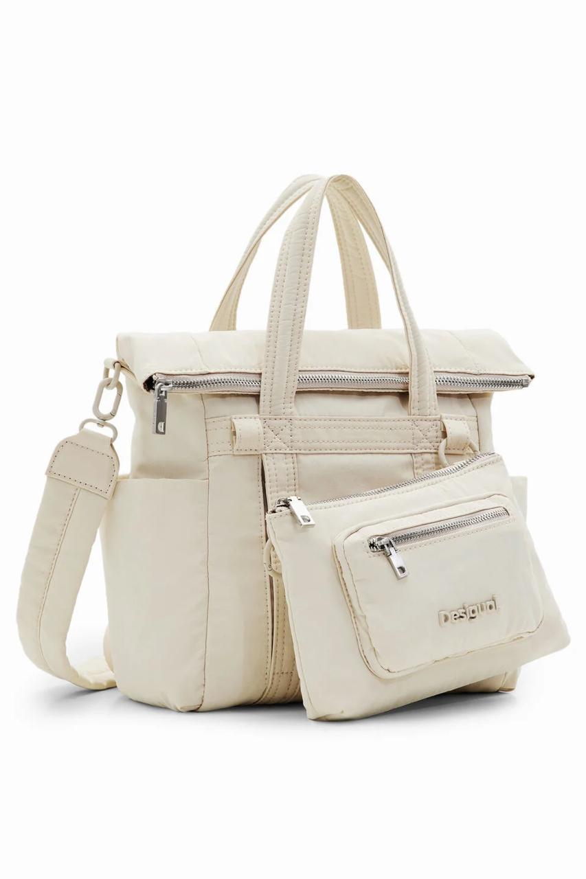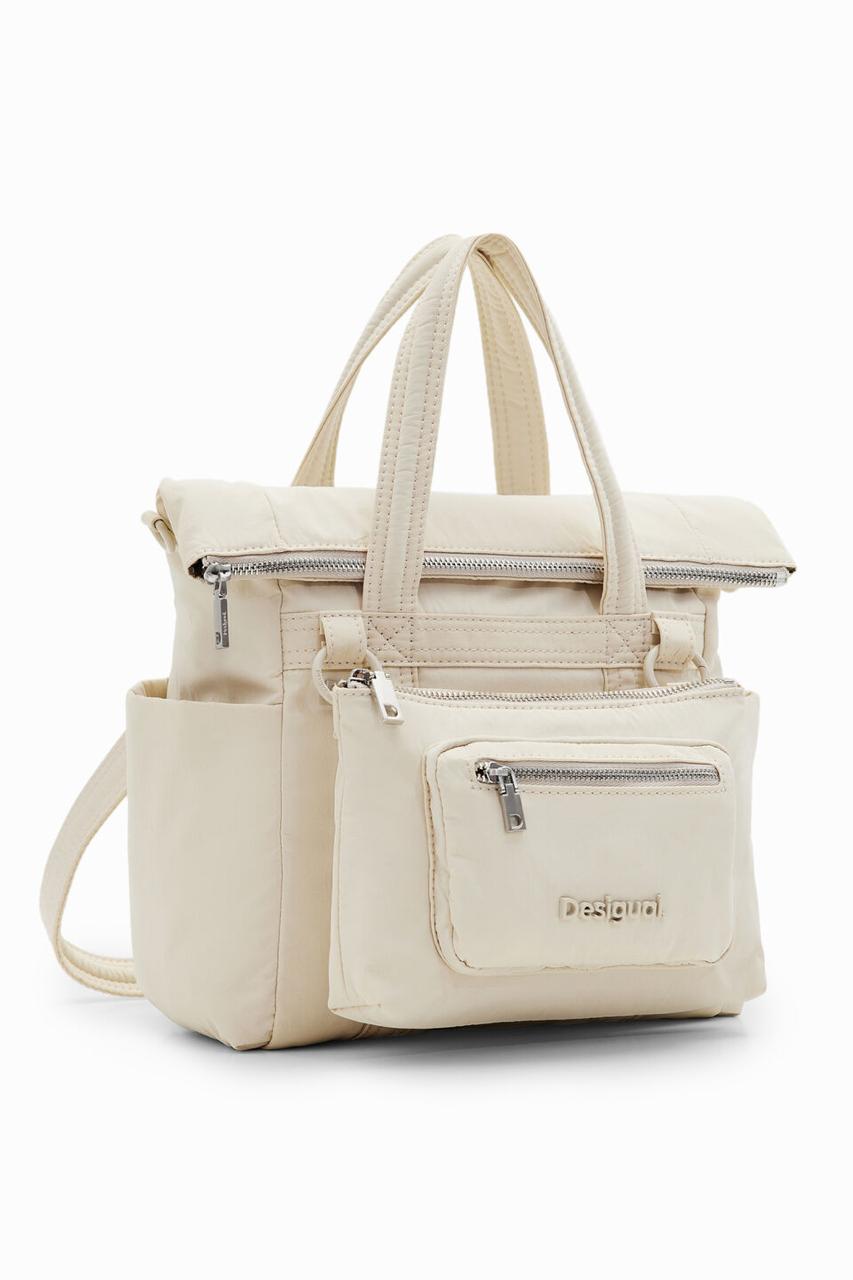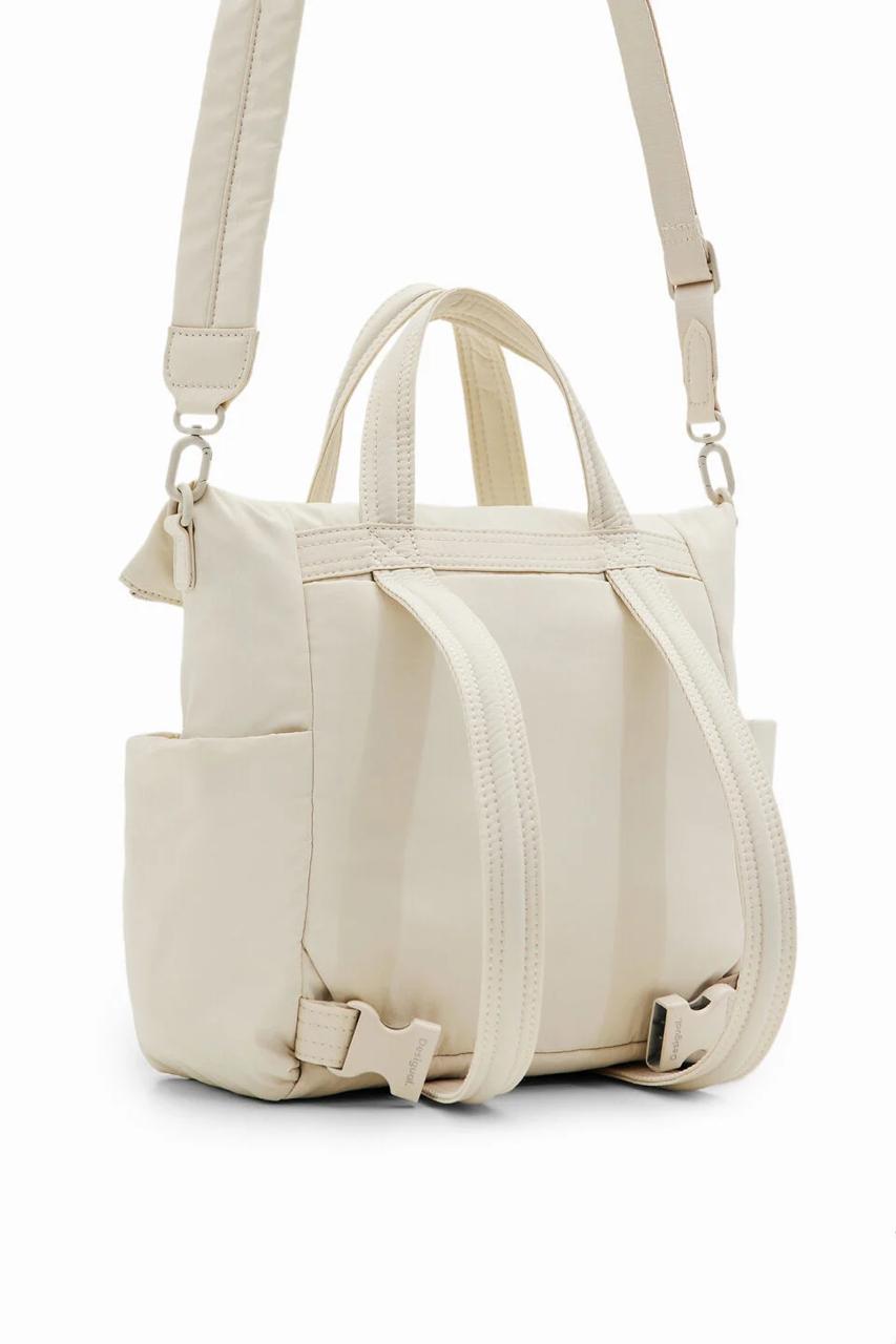 Sac à dos en nylon uni de taille moyenne, doté de plusieurs poignées permettant de le porter à la main. Bandoulière amovible et nombreuses poches incluses.