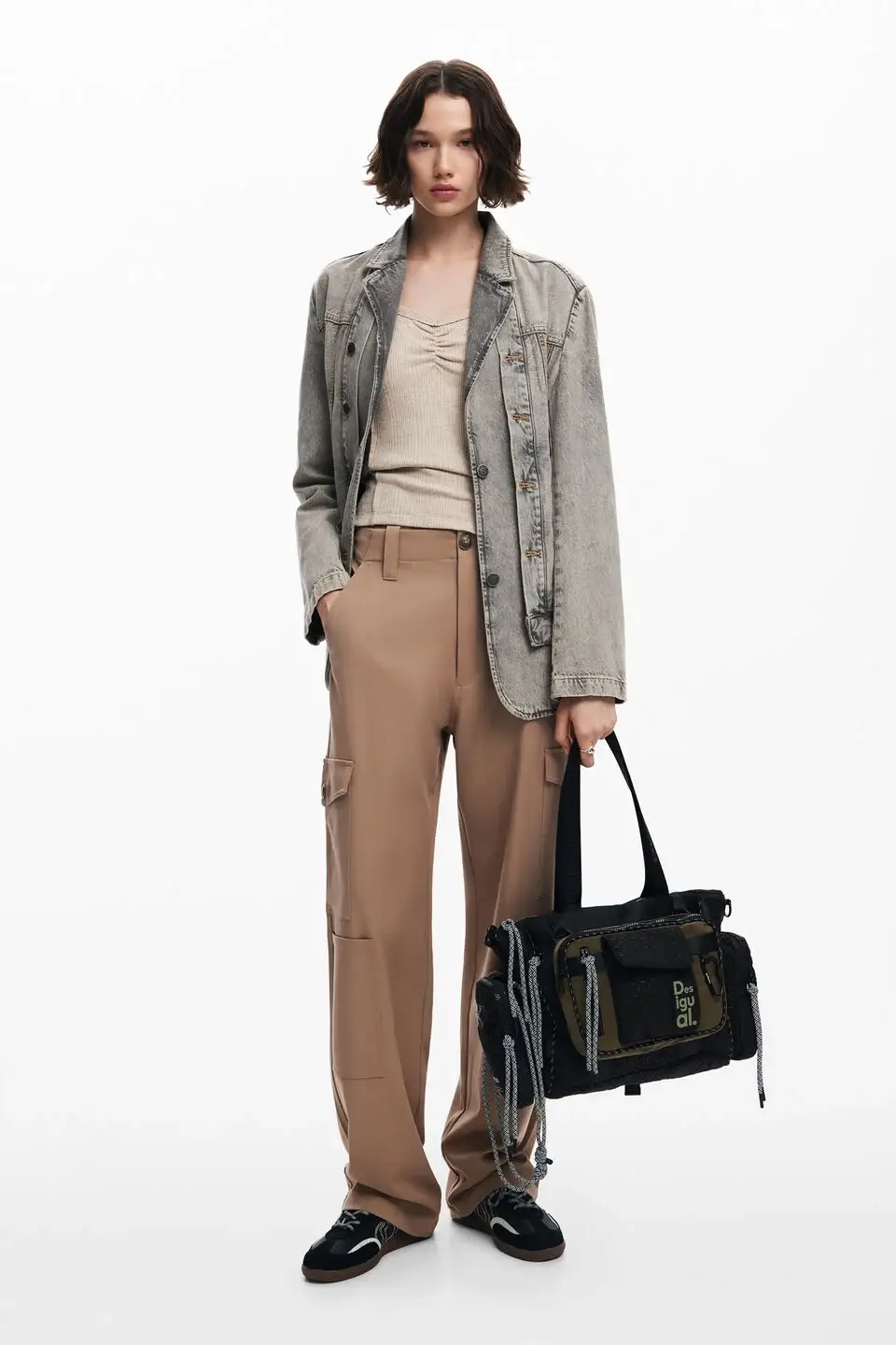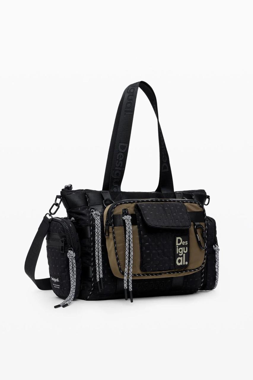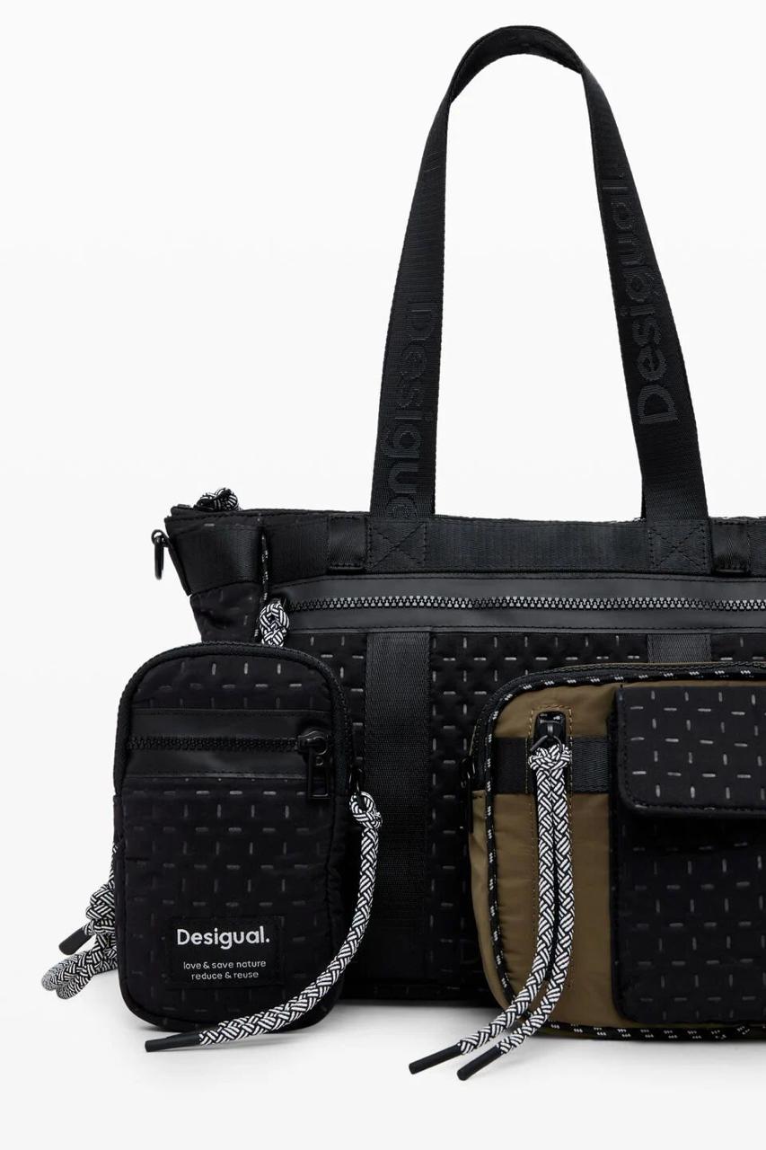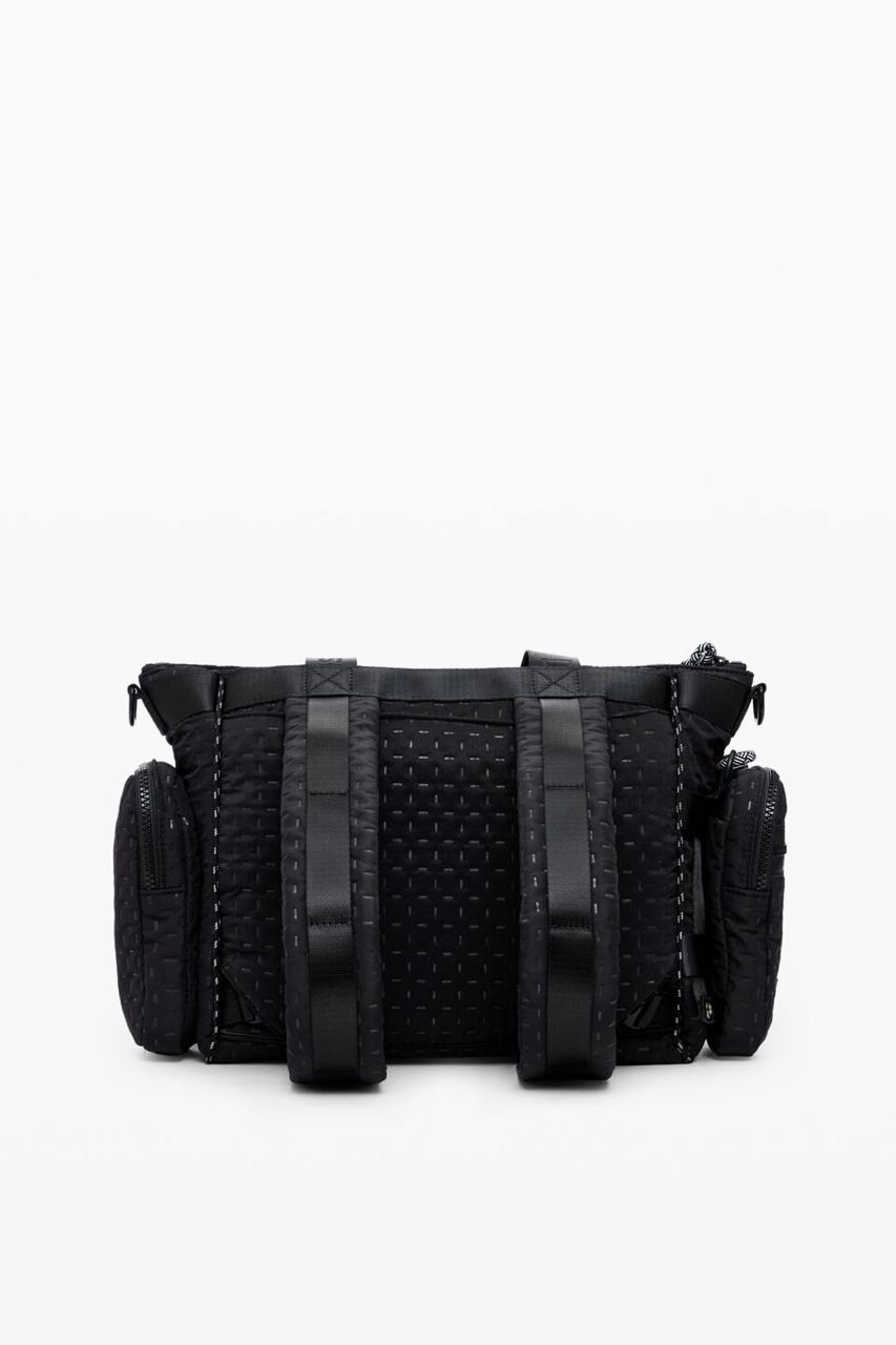 Sac à main en nylon multiposition avec plusieurs anses permettant de le transformer en sac à dos ou en sac bandoulière. Comprend une pochette amovible avec porte-téléphone et de multiples poches.